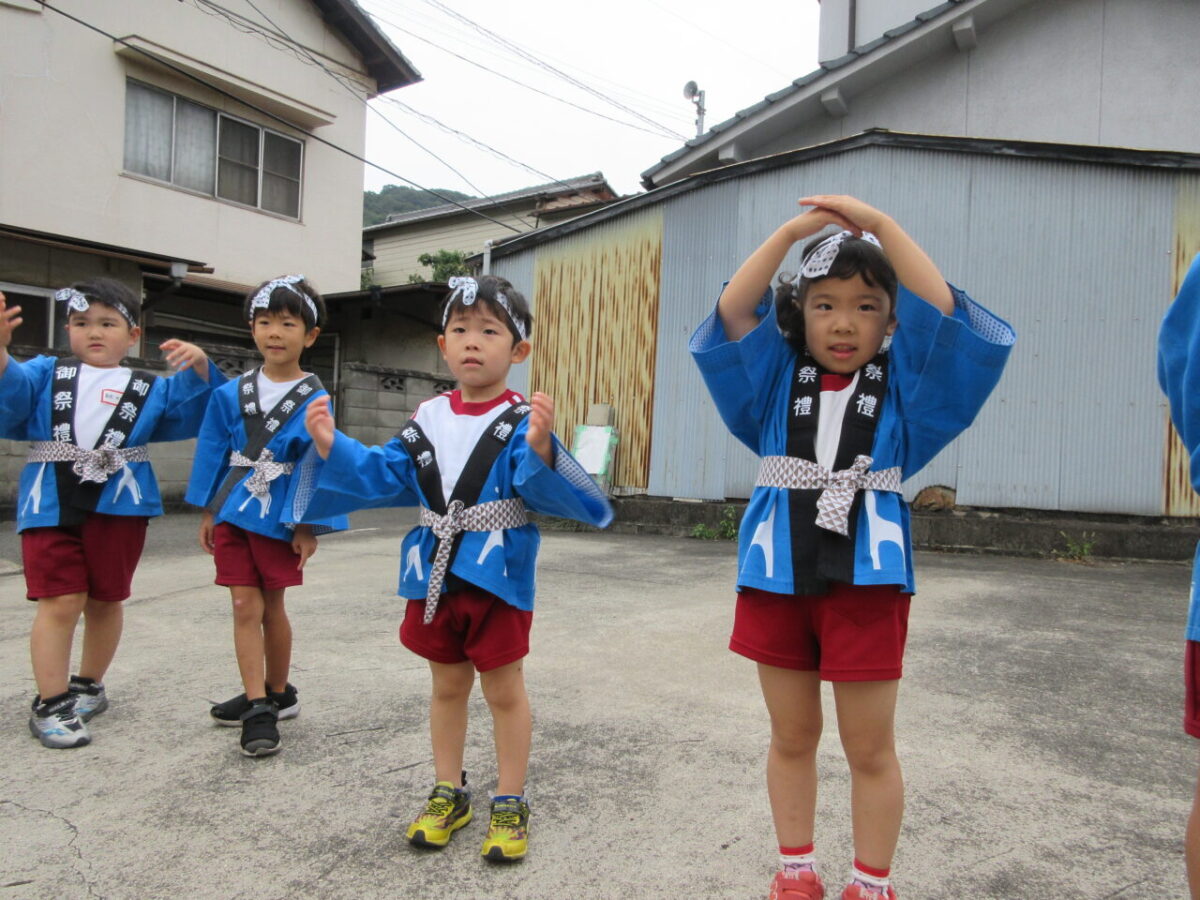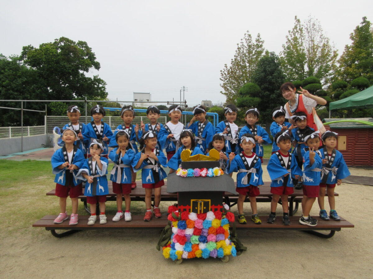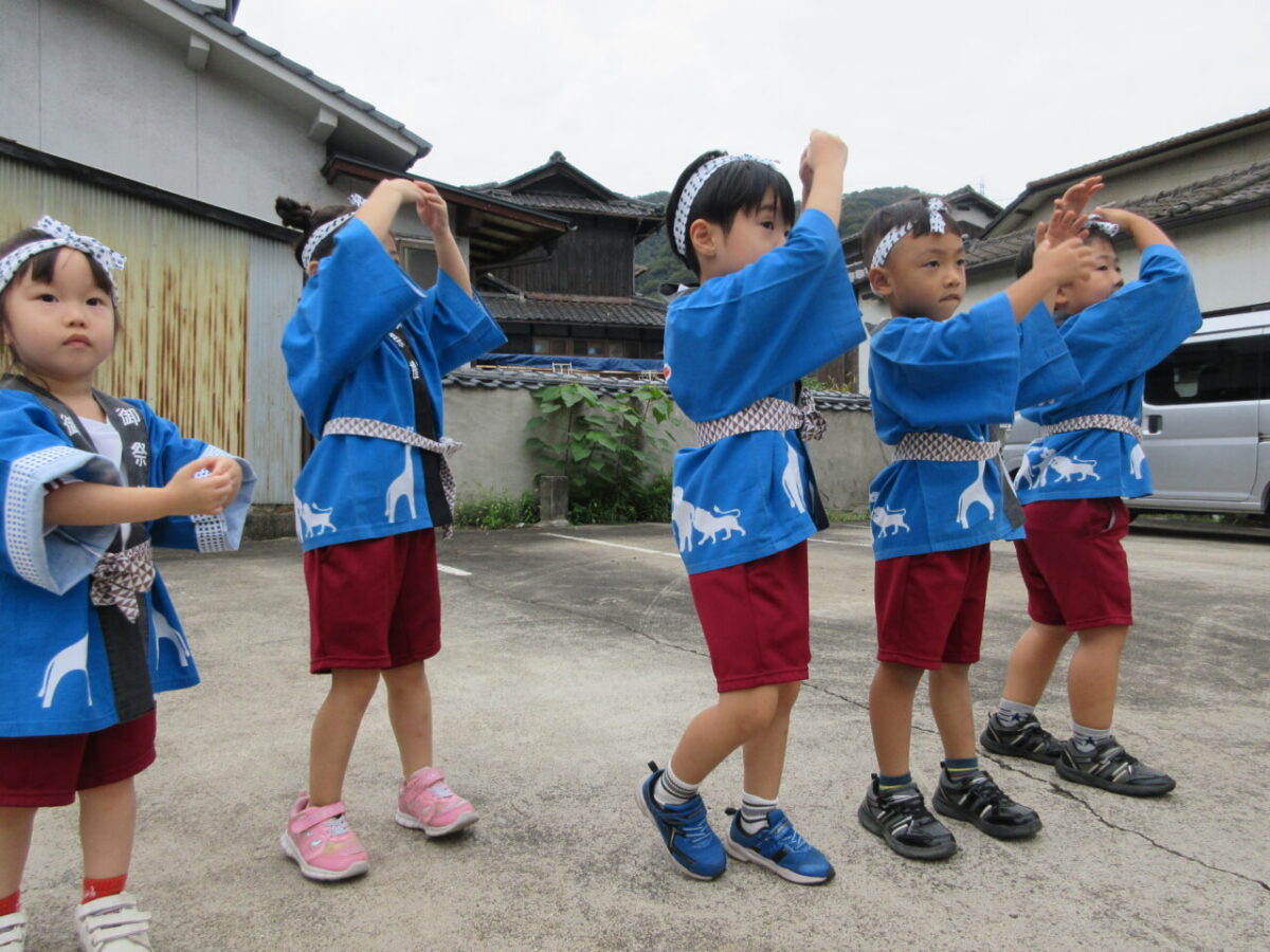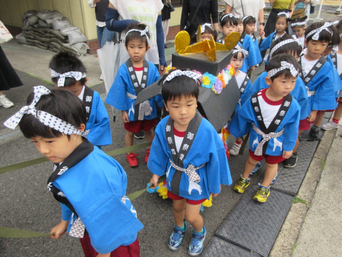 ひまわり組は法被を着てお神輿を引っ張って歩きました。